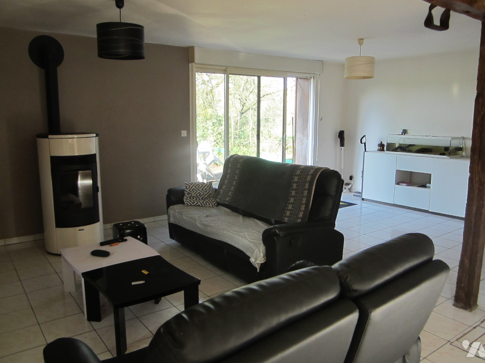 Séjour avec poêle à pellet pour un confort maximum, baie vitrée donnant sur la terrasse.