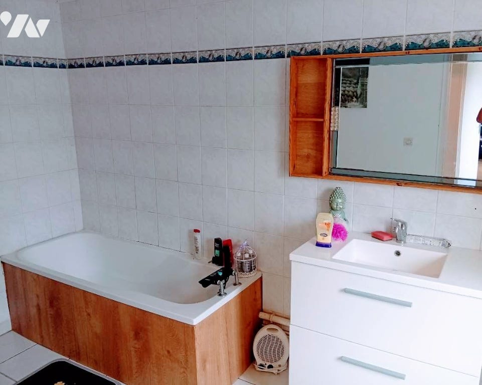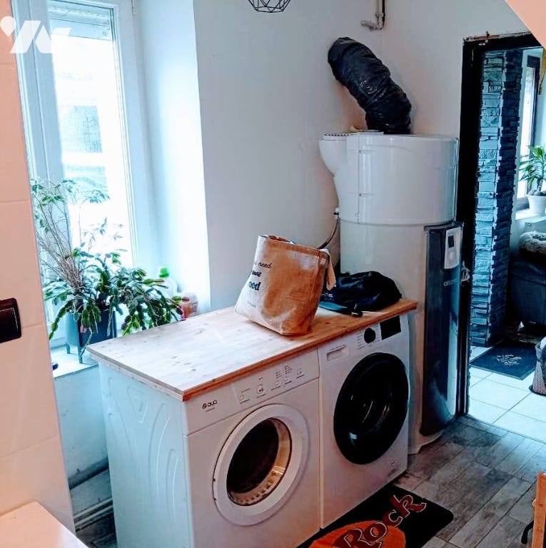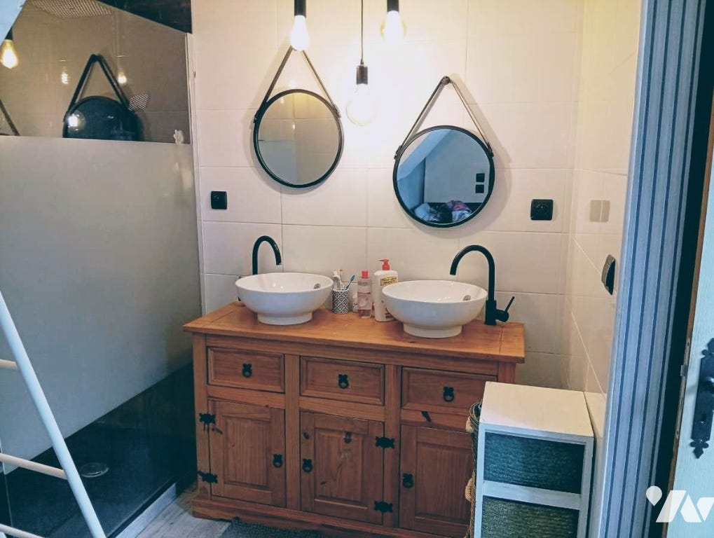Salle de bain avec douche italienne et meuble double vasques, espace laverie pratique et fonctionnel. WC indépendant